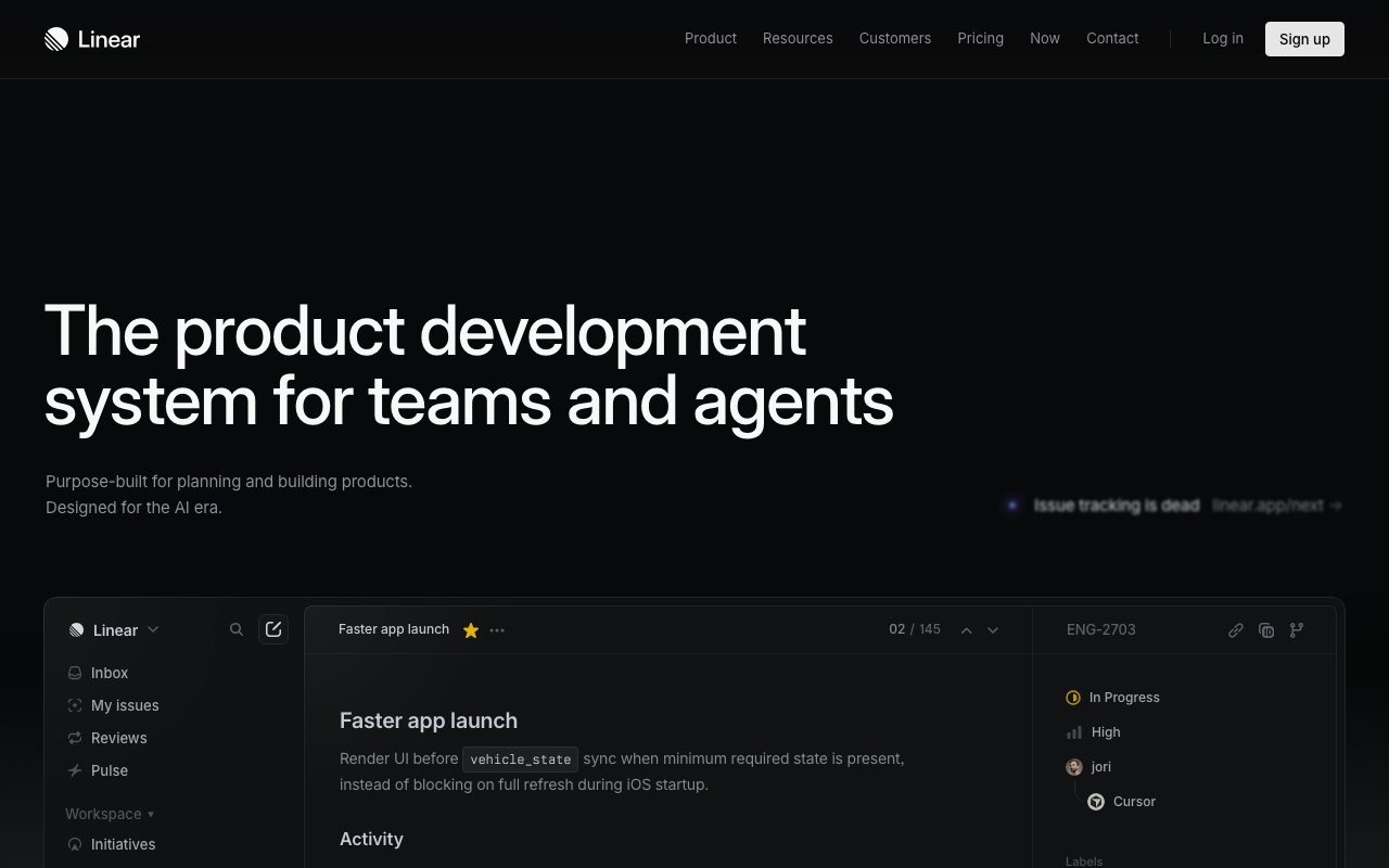 Hero clarity: Linear's landing page communicates the value proposition in under 5 seconds. The headline answers "what is this?" and the subhead answers "why should I care?"